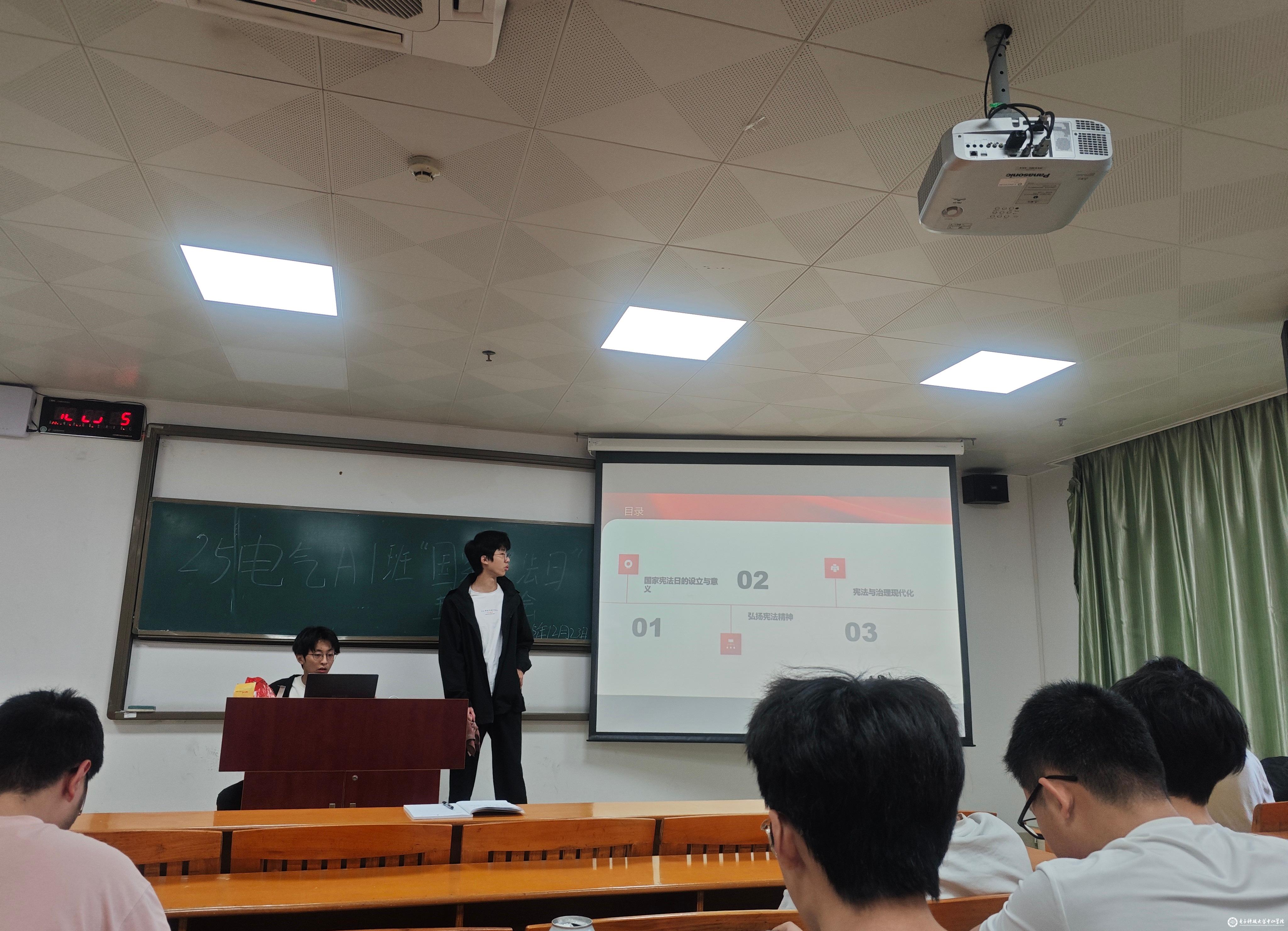 12月23日,25电气A1班在厚德楼A207教室开展“国家宪法日”主题班会,通过宪法知识系统学习与互动研讨,深化青年学子对法治精神的理解认知。班会以“弘扬宪法精神 共建法治校园”为主线,系统阐释宪法精神内涵,引导同学们树立法治信仰,厚植法治意识。此次活动作为班级法治教育的重要载体,有效提升了同学们的法律素养与责任意识。