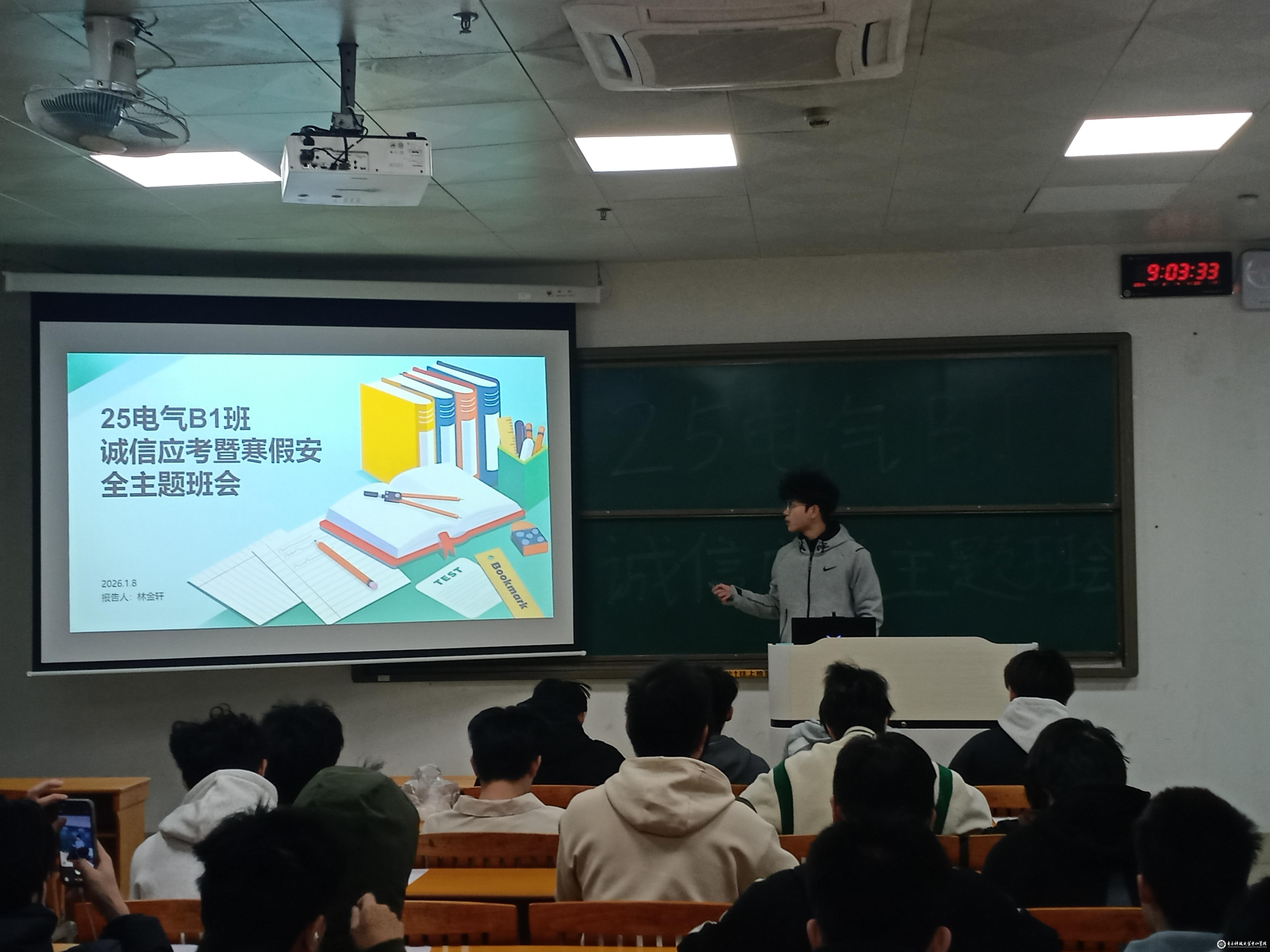 为强化同学们的诚信应考意识,筑牢寒假安全防线,确保大家平稳度过考试季与假期生活。2026年1月8日上午9点,25电气B1班在厚德楼A104教室召开诚信应考暨寒假安全主题班会。本次班会由林金轩同学主持,25电气B1班全体成员悉数参与。