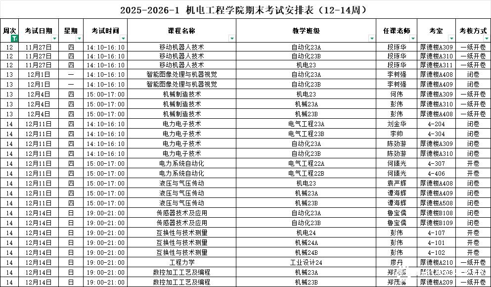 2025-2026-1 机电工程学院期末考试安排表(12-14周)