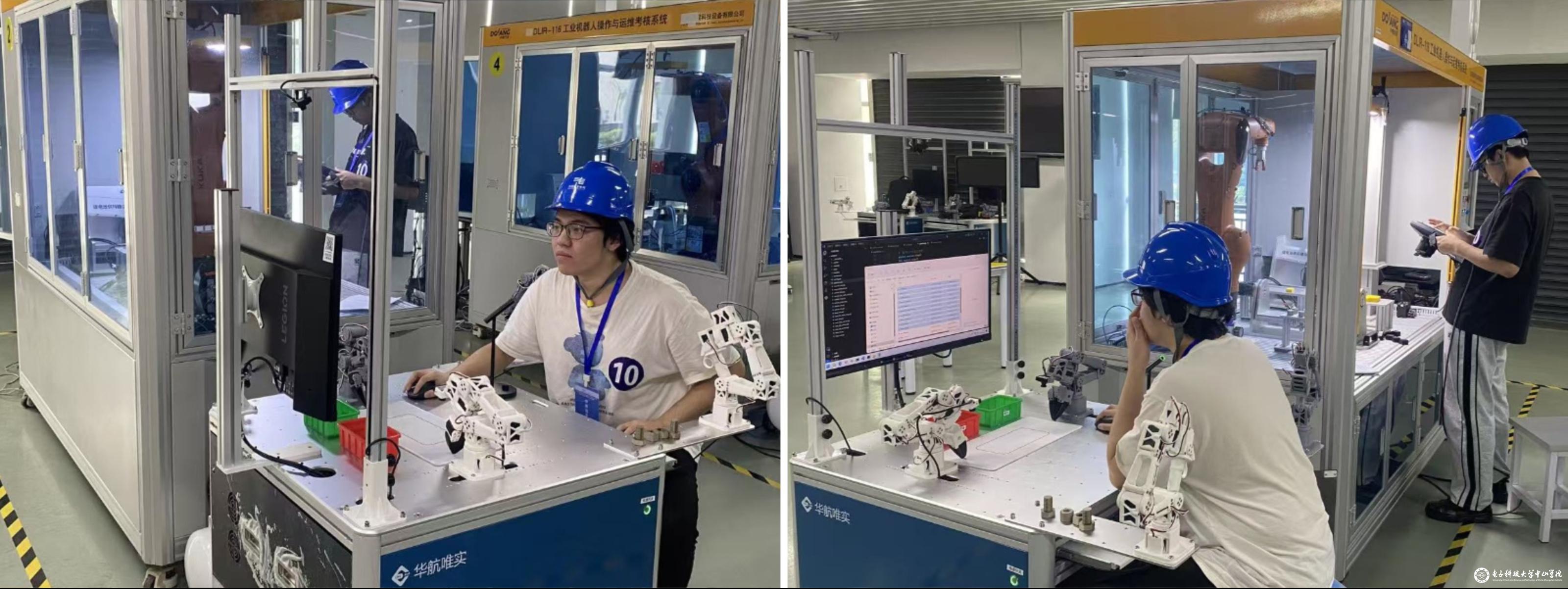 比赛期间,两位同学于首日下午顺利完成理论考试,次日下午在实操现场沉着冷静、有条不紊,精准完成智能工业机器人平台部署、自然语言交互系统调试、工业机器人工作站的编程与调试、系统综合应用等两大模块的要求,凭借扎实的专业功底和稳定的发挥赢得评委的高度认可。