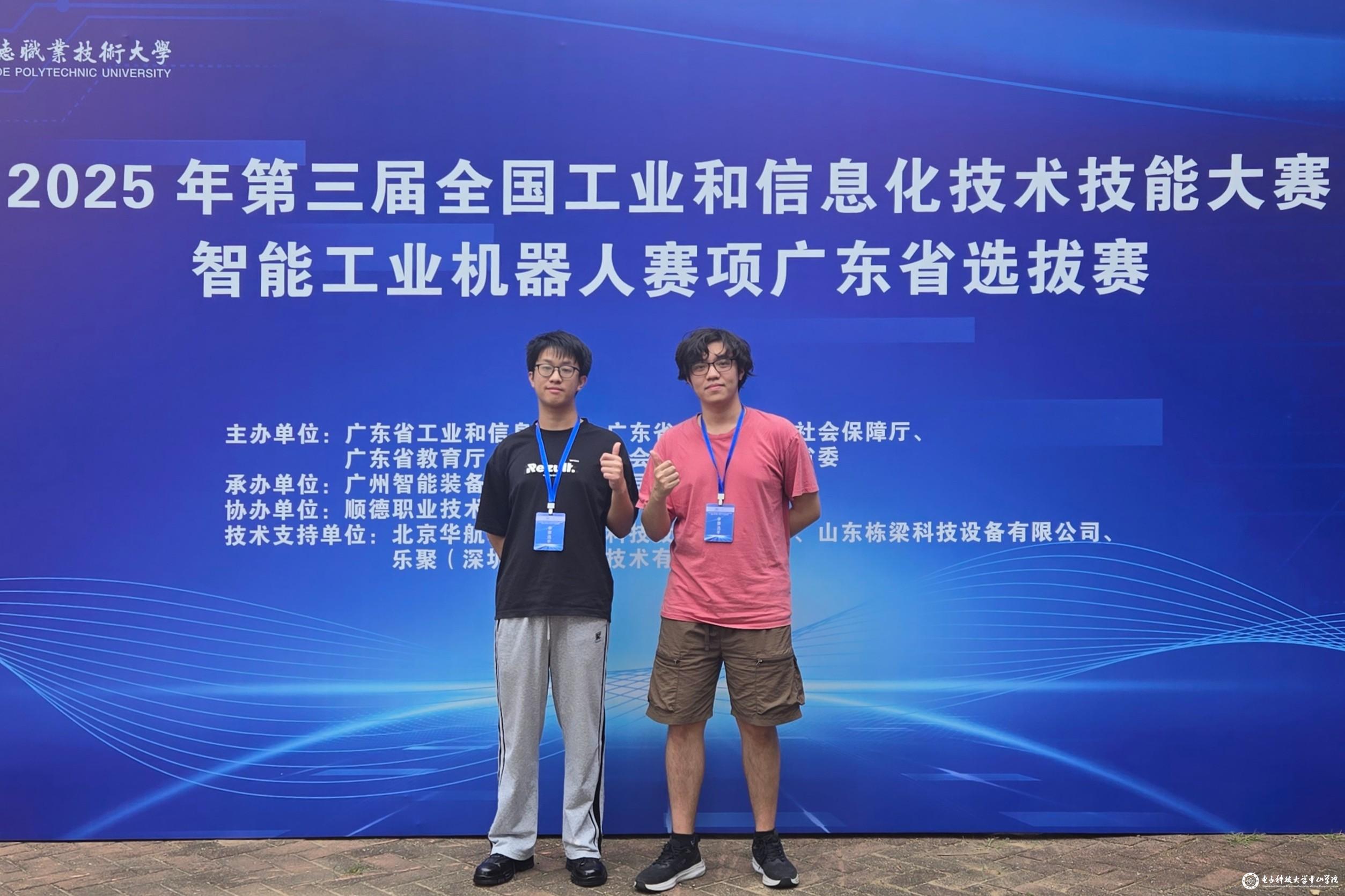 近日,第三届全国工业和信息化技术技能大赛智能工业机器人赛项广东省选拔赛在顺德落幕。我院古乙琅、郑译晨同学在于楚泓老师指导下,克服设备不熟悉、备赛时间紧张等困难,沉着应战、精准实操,最终斩获全省二等奖,实现我院在该项赛事中的首次突破。
